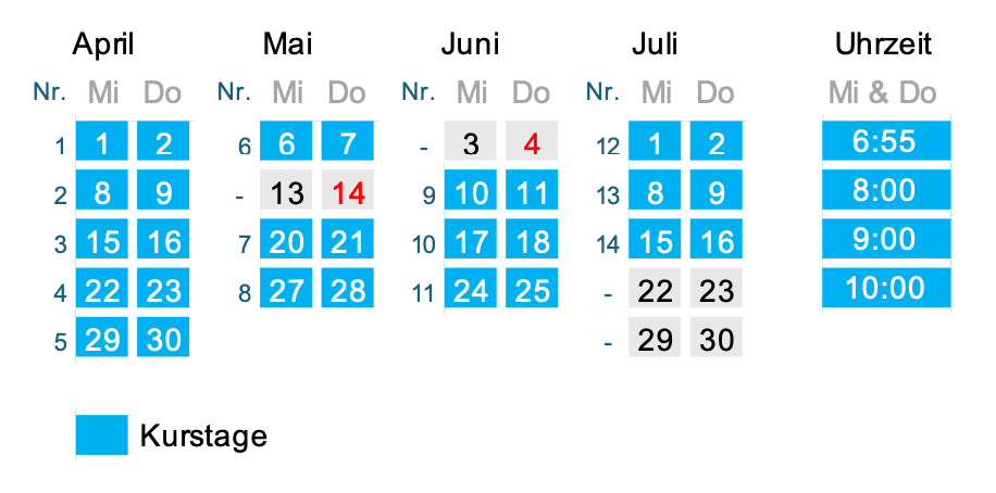 Für die Anmeldung teilen Sie mir bitte Ihre vollständigen Kontaktdaten und Ihren gewünschten Wochentag und Uhrzeit mit. Falls an Ihrem gewünschten Wochentag und Uhrzeit kein Platz frei ist, können Sie sich auf die Warteliste setzen lassen.